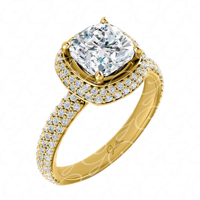En sus brazos lleva tres hileras de pequeños diamantes, luciendo al centro dos hileras de diamantes que rodean elegantemente una corona de cuatro puntas que enjoya la hermosa gema principal: un precioso diamante de corte cojín, siendo un glamuroso diseño perfecto para una glamurosa pedida de compromiso.