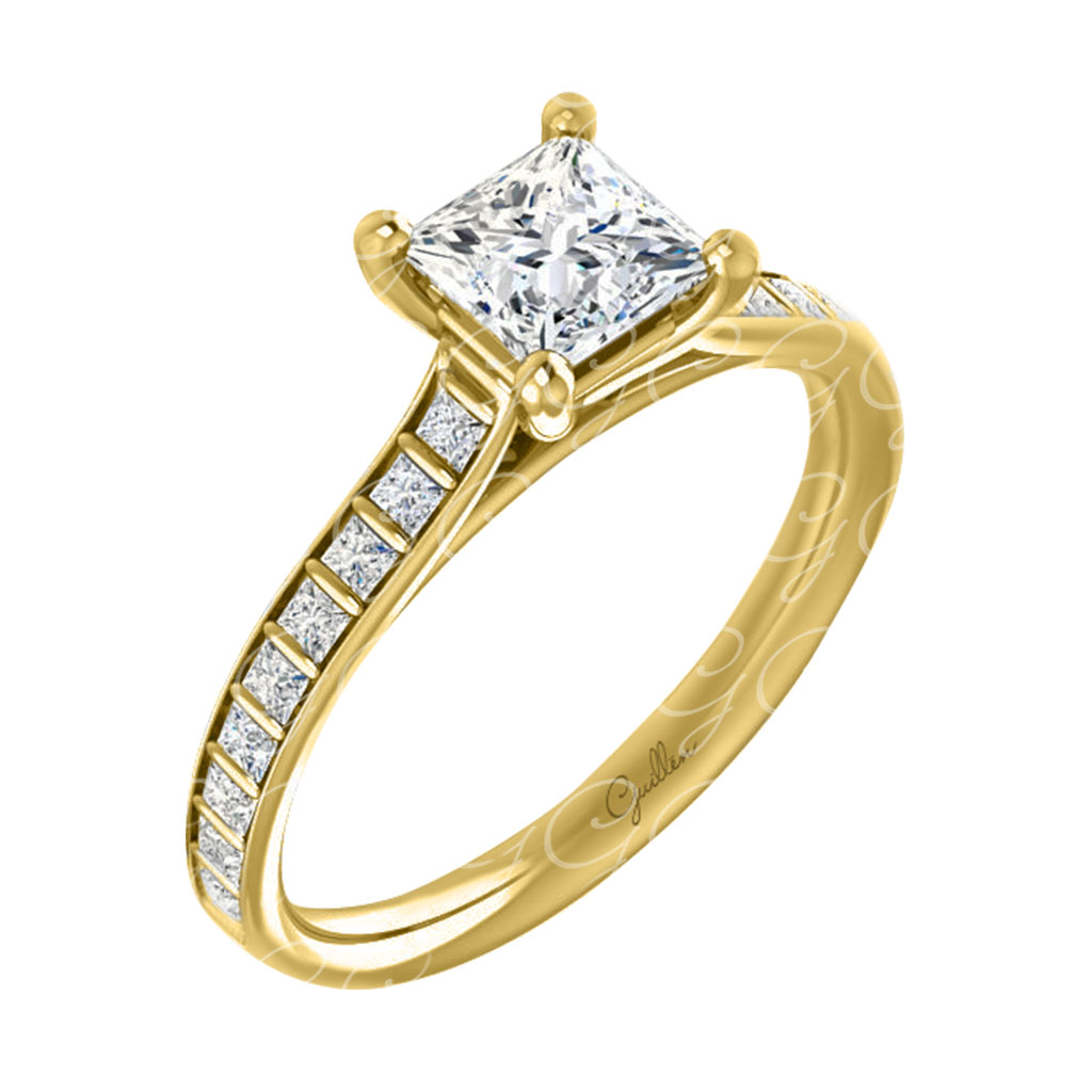 Hermoso anillo de compromiso, en el cual resalta un magnifico diamante de corte princesa enjoyado en una corona de cuatro puntas acompañado en sus laterales por nueve diamantes de similar corte de cada lado.